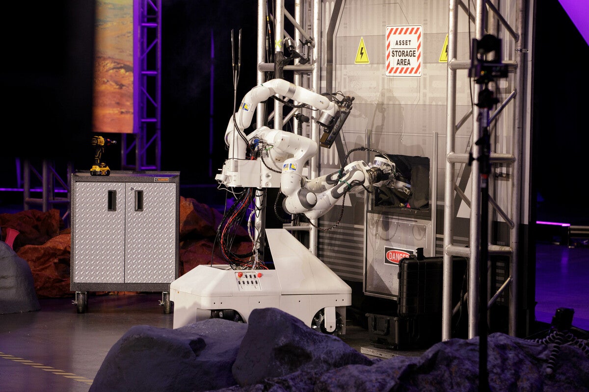 Pictured: Team NimbRo's avatar completes tasks on the testing course in record-breaking time, moments before claiming the grand prize winner title.