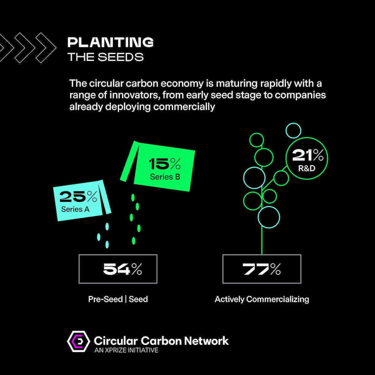 But what is the Circular Carbon Network? The Circular Carbon Network (CCN) is an XPRIZE initiative founded on the idea of building and nurturing the most important sector of the 21st century — managing our waste CO2, converting a portion of that waste into a valuable, sustainable resource for society. We noticed a severe lack of data about startups, investors, and market trends in the field, and decided to try to help fill that gap. The Circular Carbon Network provides insight into the economic history and psychology of the rapidly growing carbontech field by studying four different groups: Innovators, Investors, Corporates, and Catalysts.